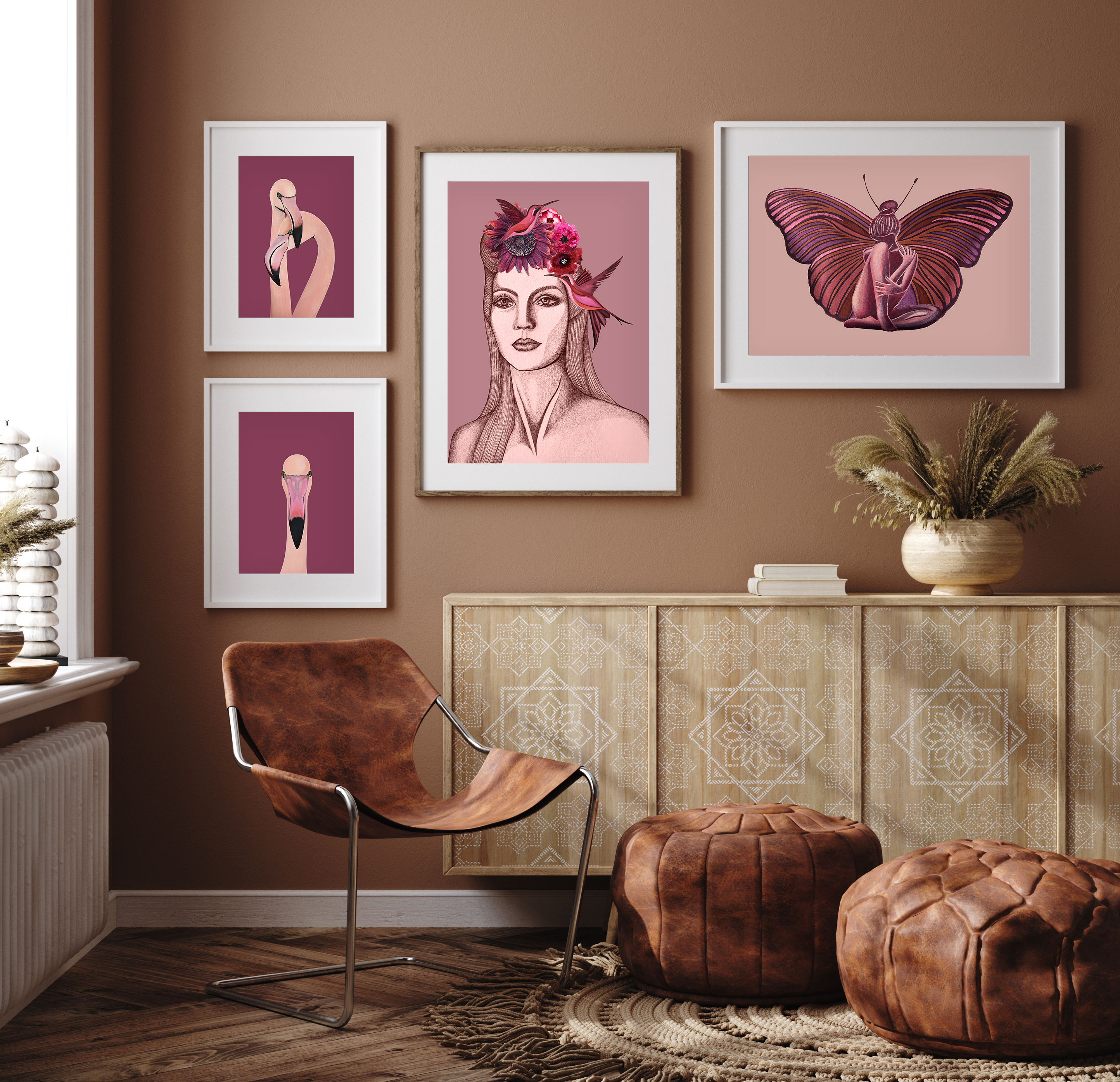 Tittel: "Fade into You" Et feminint kunsttrykk med en fortvilt kvinne sittende i en vakker blomst, der en sommerfugl lander for å trøste. Det håndmalte motivet etterlater en lun, drømmende og varm stemning til rommet.