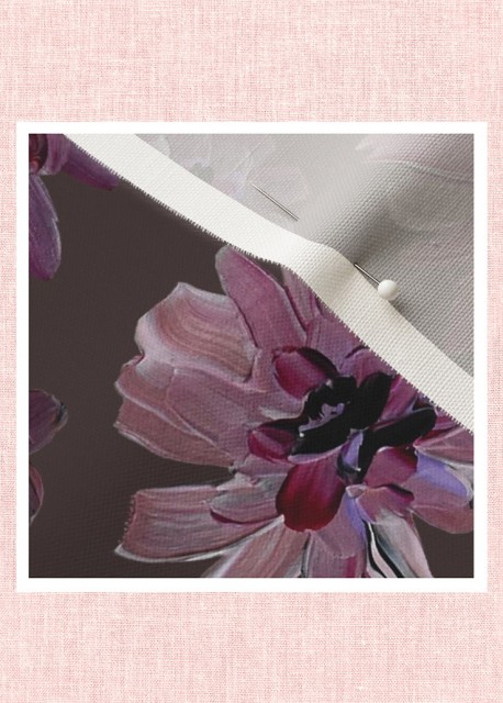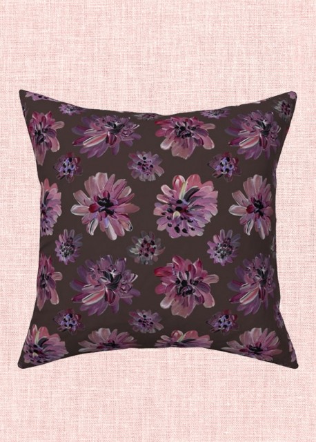 En fin pyntepute med dekorativt mønster av håndmalte blomster i rosa og lillatoner. Fjonge fargeklatter som frisker opp en sofa, utemøbler, seng eller lesekrok. Tekstilet er en blanding av naturlig bomull og lin med litt struktur.