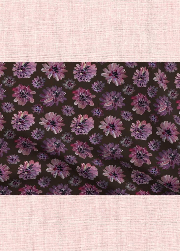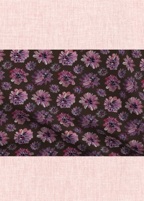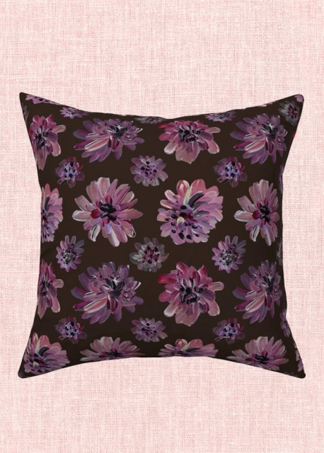 En fin pyntepute med dekorativt mønster av håndmalte blomster i rosa og lillatoner. Fjonge fargeklatter som frisker opp en sofa, utemøbler, seng eller lesekrok. Tekstilet er en blanding av naturlig bomull og lin med litt struktur.