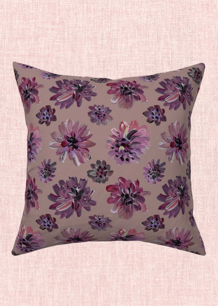 Leveres uten innerpute. Putetrekket tåler å vaskes på 40 grader, men for lengre holdbarhet i farger anbefales det å velge finvask på 30 grader med et mildt vaskemiddel. Strykes eller dampes lett etter tørk liggende på klesstativ. Veldig fine å kombinere sammen med de andre håndmalte blomstene i serien: "Mormormønster"