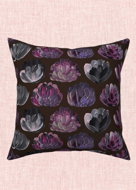 Leveres uten innerpute. Putetrekket tåler å vaskes på 40 grader, men for lengre holdbarhet i farger anbefales det å velge finvask på 30 grader med et mildt vaskemiddel. Strykes eller dampes lett etter tørk liggende på klesstativ. Veldig fine å kombinere sammen med de andre håndmalte blomstene i serien: "Mormormønster"