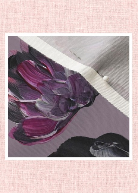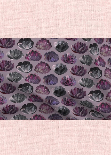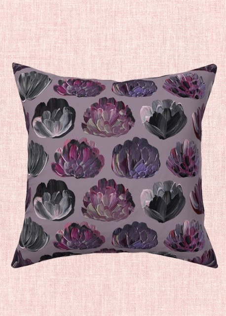 En fin pyntepute med dekorativt mønster av håndmalte blomster i rosa og lillatoner. Fjonge fargeklatter som frisker opp en sofa, utemøbler, seng eller lesekrok. Tekstilet er en blanding av naturlig bomull og lin med litt struktur.